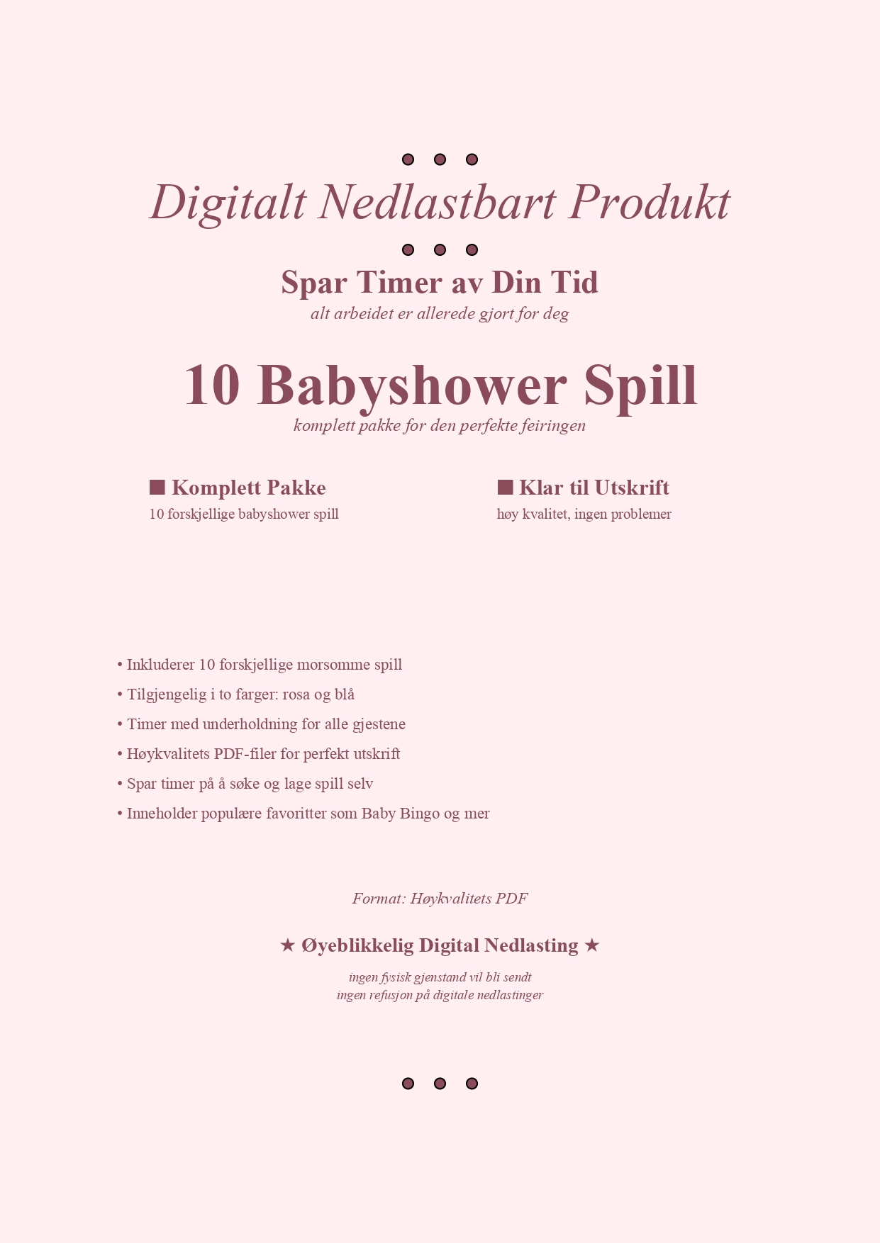 Denne pakken inneholder over 10 profesjonelle babyshower spill – fra baby bingo til quiz og gjett-leker. Alt i PDF-format, klart til nedlasting og print. Ingen stress. Ingen planlegging. Bare en uforglemmelig fest gjestene vil snakke om lenge.